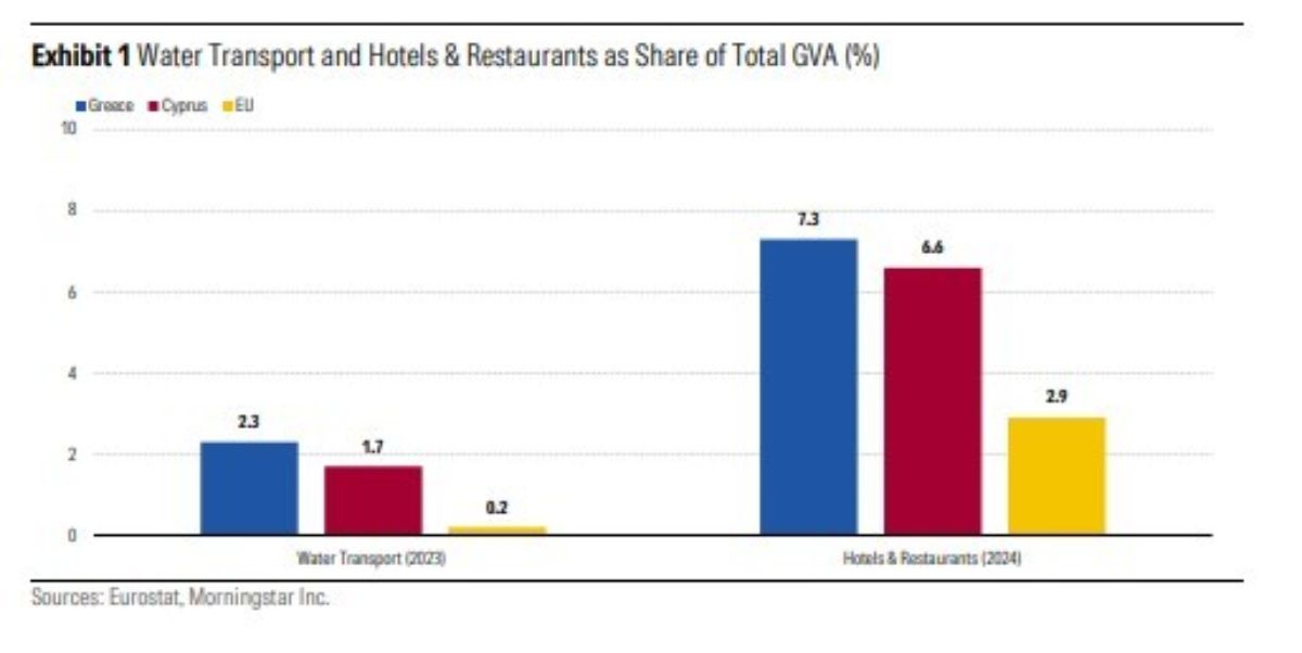Οι κλάδοι του τουρισμού και της ναυτιλίας διαδραματίζουν πολύ σημαντικότερο ρόλο στις οικονομίες της Ελλάδας και της Κύπρου σε σχέση με τις περισσότερες άλλες χώρες της Ευρωπαϊκής Ένωσης. Αυτό αποτυπώνεται ξεκάθαρα στο συγκριτικά μεγάλο μερίδιο των ξενοδοχείων και εστιατορίων στη συνολική ακαθάριστη προστιθέμενη αξία (ΑΠΑ) και στις δύο οικονομίες.