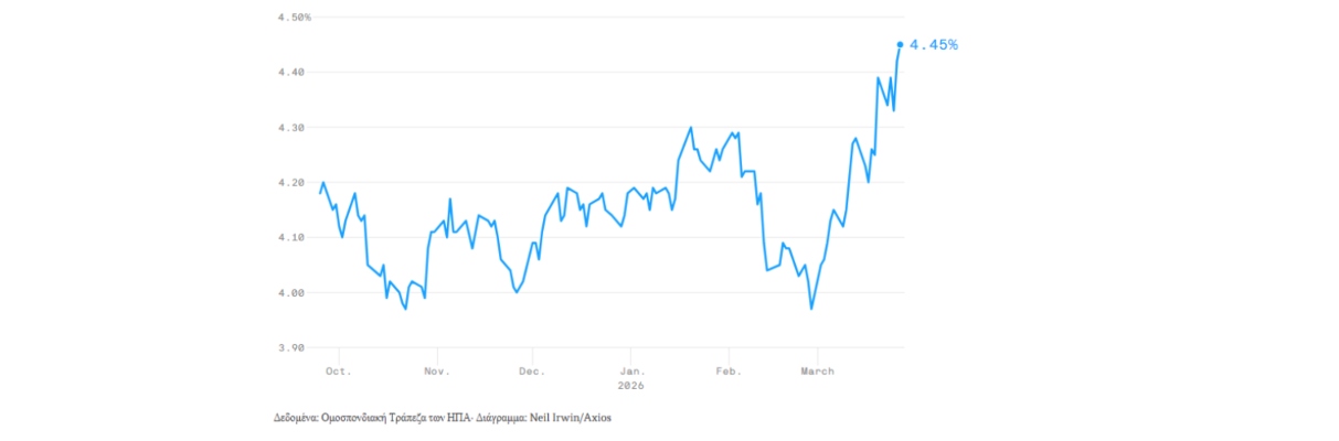 Συνολικά, η απόδοση του 10ετούς έχει κινηθεί περίπου στο 4,45 %, σχεδόν μισή ποσοστιαία μονάδα πάνω από το επίπεδο πριν από την έναρξη των αμερικανο‑ισραηλινών και ιρανικών στρατιωτικών επιχειρήσεων στα τέλη Φεβρουαρίου.