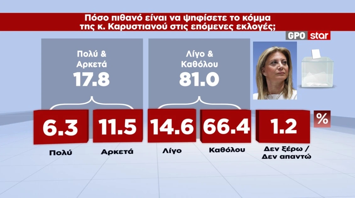 - Για το κόμμα της Μαρίας Καρυστιανού, 6,3% των ερωτηθέντων δηλώνουν πολύ πιθανό να το ψηφίσουν και 11,5% αρκετά πιθανό.