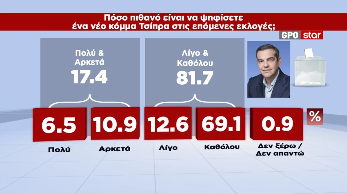 - Για το κόμμα του Αλέξη Τσίπρα, 6,5% δηλώνουν πολύ πιθανό και 10,9% αρκετά πιθανό να το ψηφίσουν.