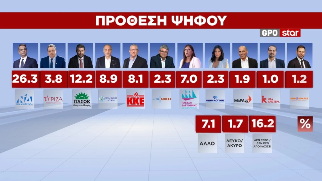 - Νέα Δημοκρατία: 26,3% στην πρόθεση ψήφου — πρώτο κόμμα και με άνοδο από προηγούμενη μέτρηση.