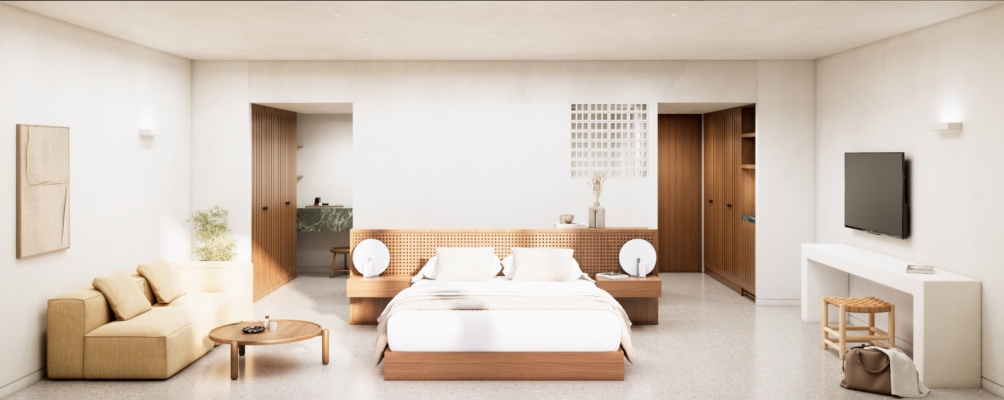 Θα ξεκινήσω από την αρχιτεκτονική λογική του έργου, που είναι πολύ σημαντική. Ο αρχιτέκτονας Γιώργος Τσολάκης, επικεφαλής του διακεκριμένου γραφείου «Tsolakis Architects+Partners», εξήγησε ότι «η αναδημιουργία του Tinos Beach στηρίχθηκε στην ανάγκη να αποδοθεί στο κτίριο μια νέα σχέση με το τοπίο, το φως και την αρχιτεκτονική παράδοση της Τήνου, μέσα από παρεμβάσεις που ενισχύουν την αίσθηση εντοπιότητας. Ιδιαίτερο χαρακτηριστικό του ανακαινισμένου κτιρίου, είναι η διαρκώς μεταβαλλόμενη όψη του κατά τη διάρκεια της ημέρας». Όπως ανέφερε, το ξενοδοχείο σχεδιάστηκε «με μια όψη πάνω στον ήλιο, δίπλα στη θάλασσα», με αναφορές στον τρόπο με τον οποίο το φως και οι σκιές μετασχηματίζουν το κτίριο από τη δύση έως την ανατολή. Παράλληλα υπογράμμισε, ότι χρησιμοποιήθηκαν τοπικά υλικά και χειροποίητες τεχνικές, ώστε το αποτέλεσμα να σέβεται ουσιαστικά τον τρόπο με τον οποίο το ίδιο το νησί είναι φτιαγμένο. «Δημιουργήσαμε ένα ξενοδοχείο που προσπάθησε να συγκεράσει φαινομενικά αντίθετα πράγματα: τις προδιαγραφές της σύγχρονης φιλοξενίας με την τοπική αρχιτεκτονική ενός νησιού όπως η Τήνος», σημείωσε χαρακτηριστικά.