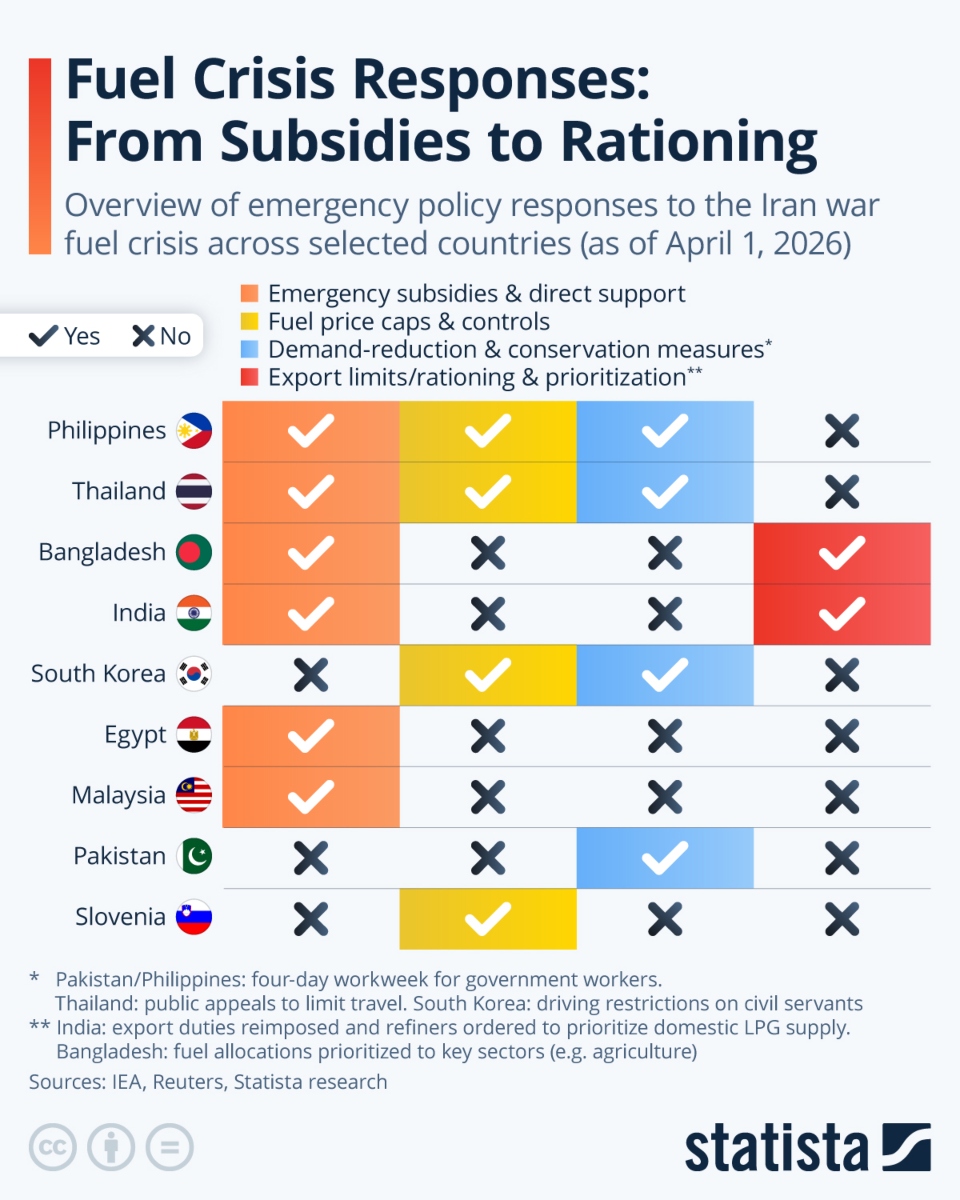 Από την Κορέα μέχρι την Ινδία, και από την Αίγυπτο μέχρι τις Φιλιππίνες, οι κυβερνήσεις ενεργοποίησαν άμεσα μέτρα έκτακτης ανάγκης για να περιορίσουν τις κοινωνικές και οικονομικές επιπτώσεις για νοικοκυριά και επιχειρήσεις. Οι παρεμβάσεις αυτές αντανακλούν την βαθιά εξάρτηση των οικονομιών από τα ορυκτά καύσιμα και την ευαλωτότητα στις ενεργειακές διαταραχές.
