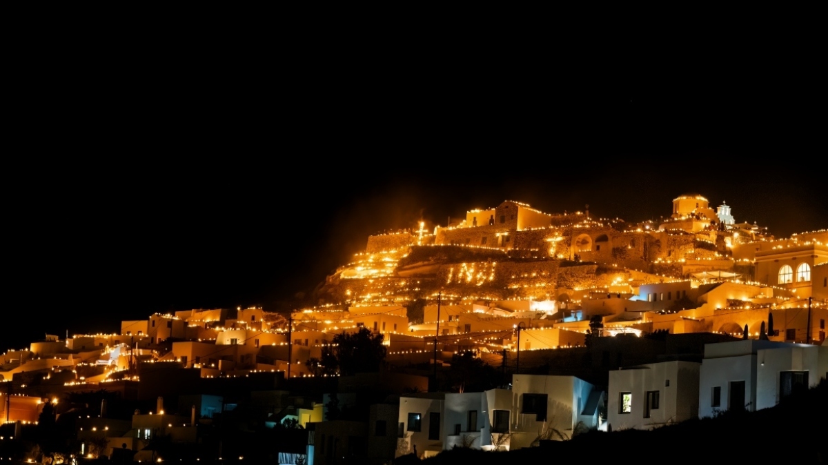 Στο χωριό Πύργος της Σαντορίνης, η Μεγάλη Παρασκευή μετατρέπεται σε ένα μαγικό θέαμα. Οι δρόμοι στολίζονται με τενεκεδένια φαναράκια που δημιουργούν ένα ποτάμι φωτός. Οι νέοι χτυπούν μεταλλικά αντικείμενα, συνοδεύοντας την περιφορά του Επιταφίου με ήχους που ενισχύουν την κατανυκτική ατμόσφαιρα. Το πρωί του Μεγάλου Σαββάτου, μετά την αναπαράσταση της Σταύρωσης, στρώνεται παραδοσιακό τραπέζι με χταπόδι στα κάρβουνα, προσφέροντας γεύση και παράδοση σε μια ήδη μοναδική εμπειρία.
