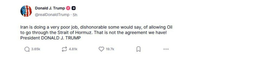 «Το Ιράν κάνει πολύ κακή δουλειά – και κάποια θα έλεγαν ανέντιμη – στο να επιτρέπει τη διέλευση πετρελαίου από τα Στενά του Ορμούζ. Δεν είναι αυτή η συμφωνία μας»