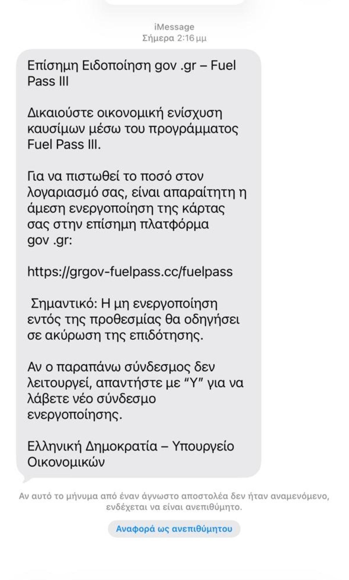 Οι δράστες χρησιμοποιούν την εικόνα και την αξιοπιστία της πλατφόρμας gov.gr, στέλνοντας μηνύματα που φαίνονται επίσημα και πειστικά. Στο περιεχόμενο του SMS, οι πολίτες καλούνται να πατήσουν σε έναν σύνδεσμο για να «ενεργοποιήσουν» δήθεν την κάρτα Fuel Pass III, προκειμένου να λάβουν την κρατική επιδότηση για καύσιμα.