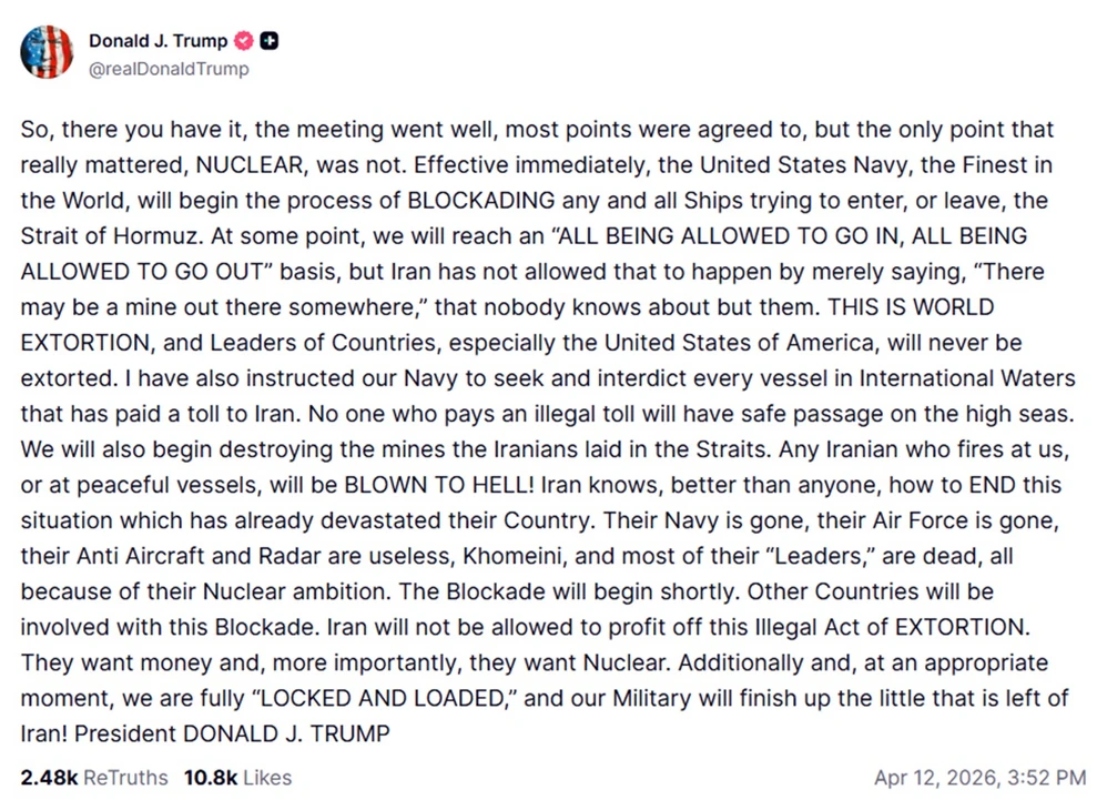 «Λοιπόν, να το, η συνάντηση πήγε καλά, τα περισσότερα σημεία συμφωνήθηκαν, αλλά το μόνο σημείο που πραγματικά είχε σημασία, η ΠΥΡΗΝΙΚΗ, δεν ήταν. Με άμεση ισχύ, το Ναυτικό των Ηνωμένων Πολιτειών, το καλύτερο στον κόσμο, θα ξεκινήσει τη διαδικασία ΑΠΟΚΛΕΙΣΜΟΥ όλων των πλοίων που προσπαθούν να εισέλθουν ή να εξέλθουν από το Στενό του Ορμούζ.