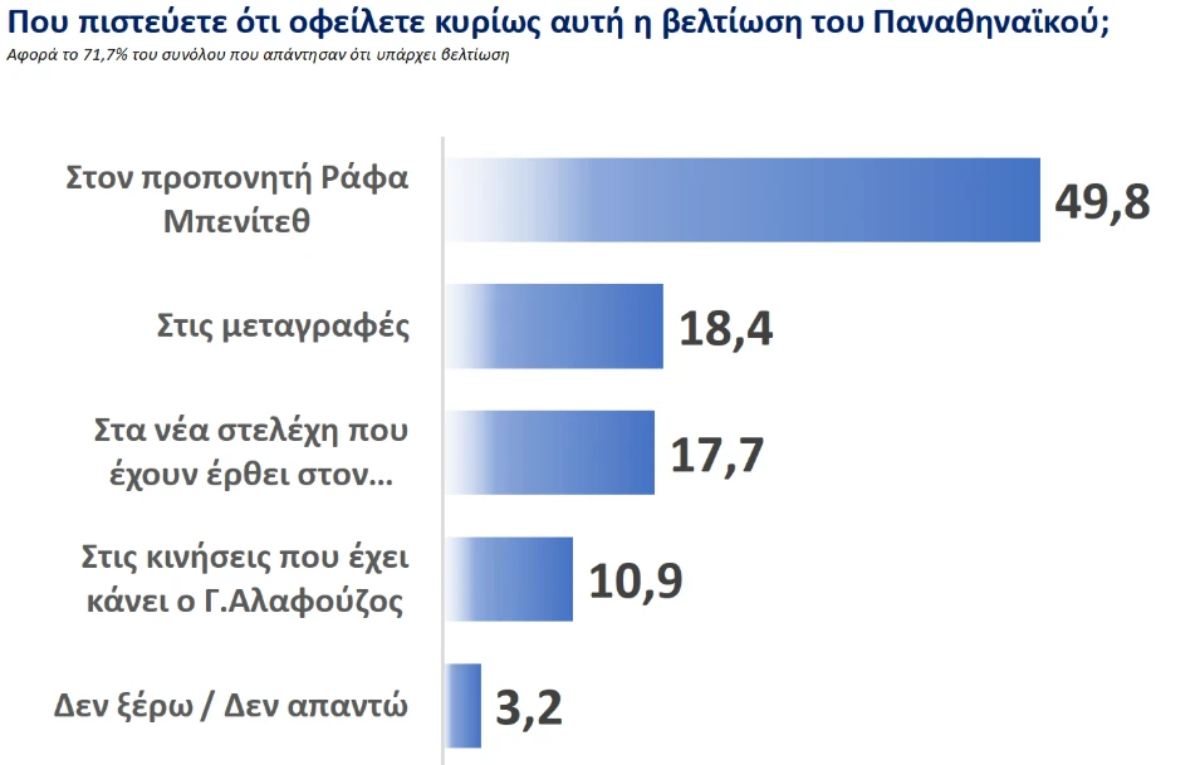 Το πιο ισχυρό συμπέρασμα που προκύπτει από τις απαντήσεις του κοινού είναι ότι η αγωνιστική άνοδος του Παναθηναϊκού συνδέεται πρωτίστως με την παρουσία και την επιρροή του Ράφα Μπενίτεθ. Σχεδόν οι μισοί συμμετέχοντες στην έρευνα, σε ποσοστό 49,8%, θεωρούν ότι η βελτιωμένη εικόνα του Παναθηναϊκού στο τελευταίο κομμάτι της σεζόν έχει σαφή τη σφραγίδα του Ισπανού τεχνικού.