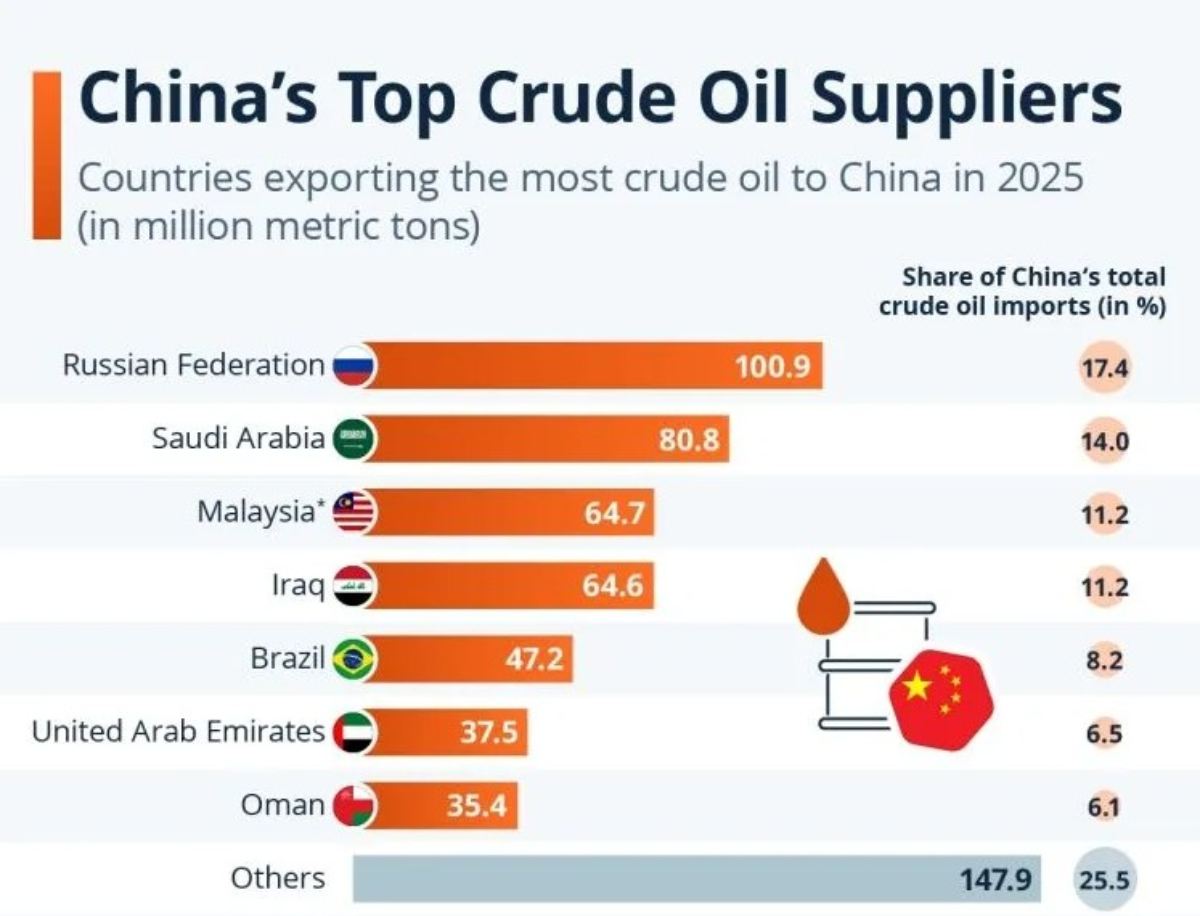 Η Κίνα εξακολουθεί να κινείται με απόλυτο ρεαλισμό στο πεδίο της ενέργειας, χτίζοντας ένα πολυσύνθετο δίκτυο προμηθευτών πετρελαίου που της επιτρέπει να περιορίζει τους κινδύνους από πολέμους, κυρώσεις και διαταραχές στις θαλάσσιες οδούς. Το 2025, οι βασικοί προμηθευτές αργού πετρελαίου της ήταν η Ρωσία, η Σαουδική Αραβία, η Μαλαισία, το Ιράκ και η Βραζιλία, με τις πέντε αυτές χώρες να καλύπτουν συνολικά περίπου το 62% των συνολικών κινεζικών εισαγωγών αργού.