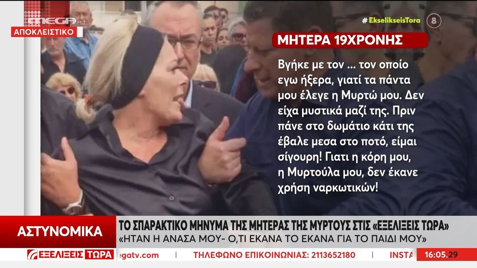 Μια νέα διαφορετική τροπή για τον θάνατο της Μυρτώς δίνει ο πατέρας της, καθώς μιλώντας στο MEGA τόνισε πως η κόρη του ήταν θύμα κυκλώματος μαστροπείας και μάλιστα θα την απήγαγαν να την φέρουν στην Αθήνα!