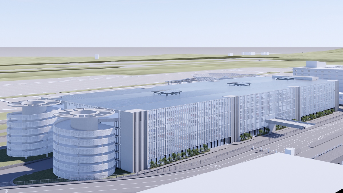 Το πρώτο έργο που έχει ξεκινήσει, είναι το 7όροφο πάρκινγκ οχημάτων, 3.500 θέσεων, που βρίσκεται δίπλα στο ξενοδοχείο (πριν όπως φτάνουμε στο αεροδρόμιο), και θα είναι έτοιμο το 2027.